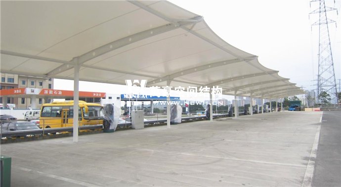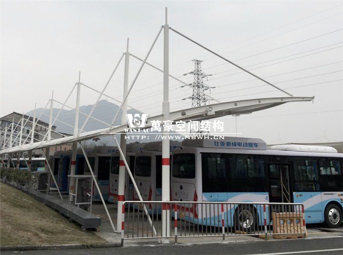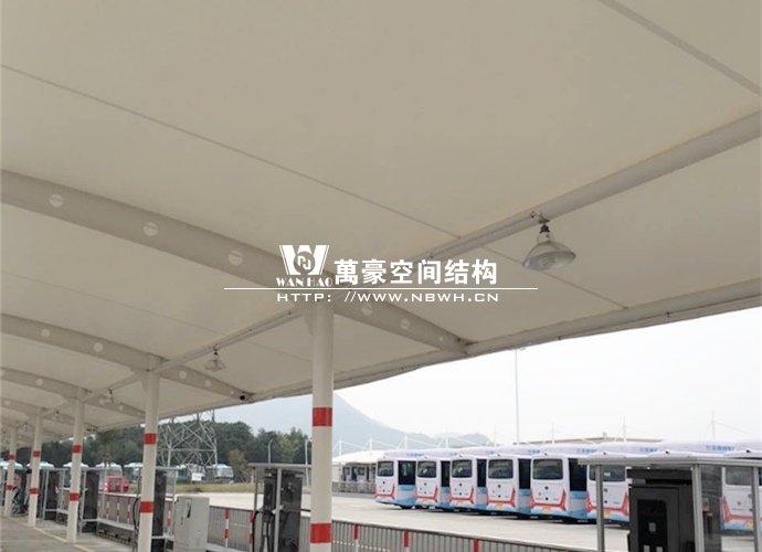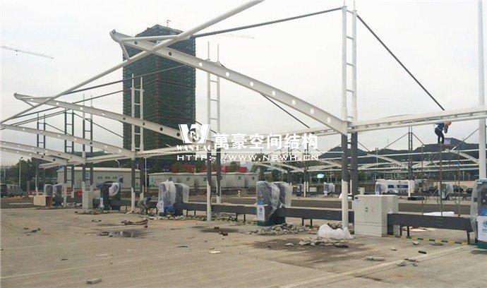 膜結(jié)構(gòu)雨棚施工面積約5138平方;用鋼量約80噸。施工難點(diǎn)在于工期緊。施工時(shí)天氣情況差,連續(xù)的陰雨天給鋼構(gòu)的油漆施工帶來(lái)了極大的麻煩并且延誤了工期。雨棚底下還要安裝充電樁,我們還要和充電樁施工班組進(jìn)行技術(shù)對(duì)接,規(guī)劃充電樁的安裝位置。由于工期緊,天氣狀況差,我們動(dòng)用了兩個(gè)施工班組加班加點(diǎn),土建、鋼構(gòu)交叉施工,最后如期完工。由于每個(gè)雨棚長(zhǎng)度比較長(zhǎng),施工班組在立好鋼構(gòu)件之后從中間開(kāi)始往兩邊安裝膜布,使工作效率有了很大的提高。