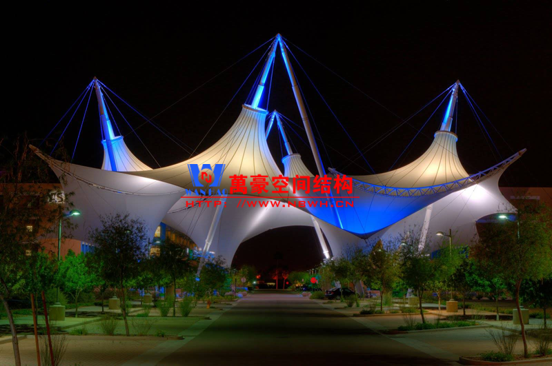 山東小品膜結(jié)構(gòu)工程的膜材是氟塑材料表面涂層與織物布基按照特定的工藝粘合在一起的薄膜材料。常用的氟塑材料涂層有PTFE(聚四氟乙烯)、PVDF(聚偏氟乙烯)等。織物布基主要用聚酯長(zhǎng)絲(滌綸PES)和玻璃纖維有兩種。膜材的粘合就是將涂層與基材合二為一組成通整體。膜結(jié)構(gòu)建筑結(jié)構(gòu)所用的膜材大多是以壓延成型和涂刮成型的。所謂壓延成型,就是將選定的軟PVDF經(jīng)塑煉后投入壓延機(jī),按照所需厚度、寬度壓延成膜,立即與布基粘合,再經(jīng)過(guò)軋花、冷卻即可制得壓延膜材。而涂刮成型,則是將聚氯乙烯糊均勻地涂或刮在布基上,再加熱處理即可獲得涂刮膜材,普遍的是采用刮刀直接涂刮,也有采用輥式涂刮的。