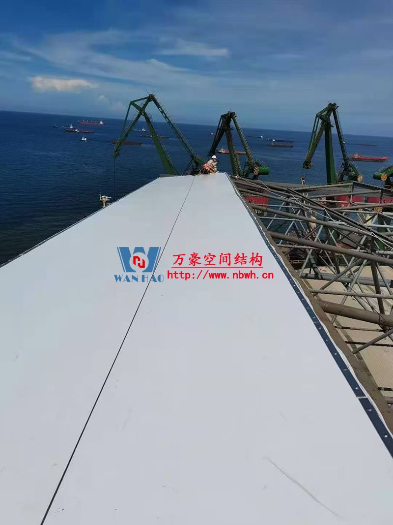 印尼全天候碼頭倉庫屋面膜結(jié)構(gòu)工程高度55米,跨度160米,采用鋼結(jié)構(gòu)地面整體拼裝,分區(qū)域整體起吊的安裝方式,鋼用量總共2000噸,膜結(jié)構(gòu)展開面積30000平米,屋面膜結(jié)構(gòu)工程由寧波萬豪空間結(jié)構(gòu)工程有限公司承建。