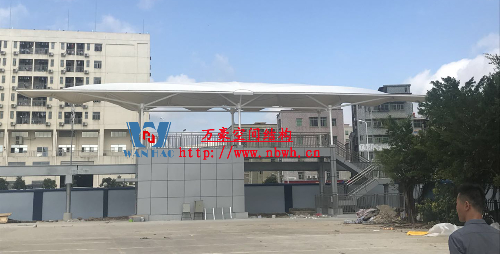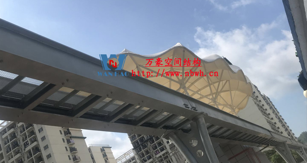 云巴園區(qū)試驗示范線膜結構工程-四角站(原名:坪山一期生產園區(qū)C型線云軌站)位于深圳市坪山區(qū)比亞迪路3009號比亞迪股份有限公司園區(qū)四角大廈西面,該工程用鋼量50噸,膜材展開面積2000平方米,遮蓋材質選用最為優(yōu)質的ETFE膜材(日本旭硝子),鋼構則選用了起拱和各種大小圓弧相融合。