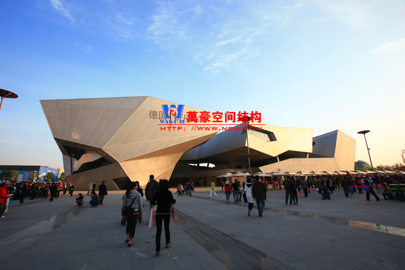 世博會(huì)德國(guó)館膜結(jié)構(gòu)建筑建成于2009年7月,于2010年在中國(guó)上海世博會(huì)上正式投入使用,是中國(guó)國(guó)內(nèi)經(jīng)典膜結(jié)構(gòu)建筑之一。德國(guó)館位于盧浦大橋附近的黃浦江南岸,與瑞士、法國(guó)和波蘭館相鄰,占地面積6000平方米。由于膜結(jié)構(gòu)材料的特殊屬性,可以讓德國(guó)館的形態(tài)呈不規(guī)則狀,十分的別致。展館四面呈開(kāi)放狀,其建筑設(shè)計(jì)給人一種輕盈、飄逸的感覺(jué),又像是在邀人同游。德國(guó)館的建筑體外部由一層透明的銀色發(fā)光建筑膜結(jié)構(gòu)包裝起來(lái),展館的四大建筑主體懸架于和諧都市展廳入口所在的底層區(qū)域。