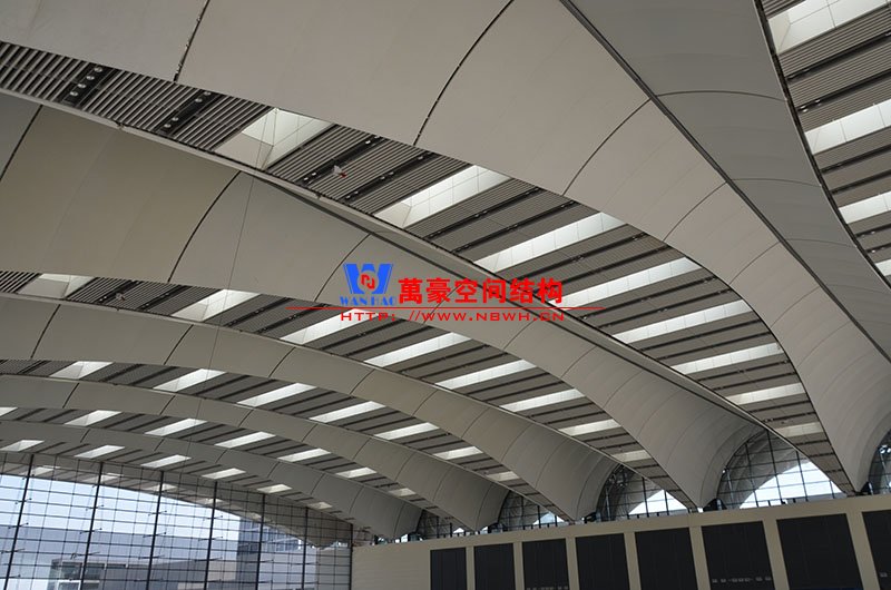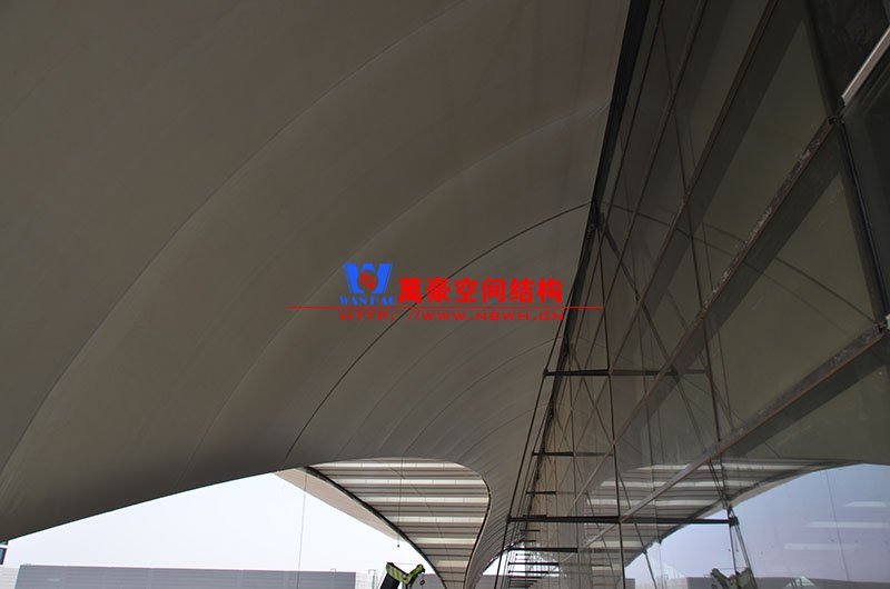 會展中心的入口大廳采用全透明幕墻,將南北向迥然不同的城市景觀聯(lián)系起來,輕質(zhì)半透明屋頂覆蓋入口大廳的公共區(qū)域,輕盈的白色薄膜材質(zhì)配以照明燈光,使整個大廳明亮而通透。該膜結(jié)構(gòu)幕墻項目由寧波萬豪空間結(jié)構(gòu)工程有限公司承建,項目完成的十分完美。