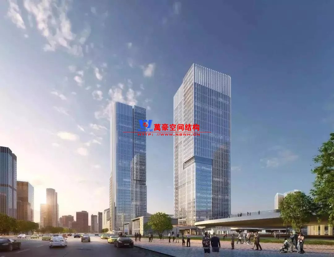 兩棟塔樓之間的底部跨度約60米,中間由約22米的鋼結(jié)構(gòu)拱連橋相接。