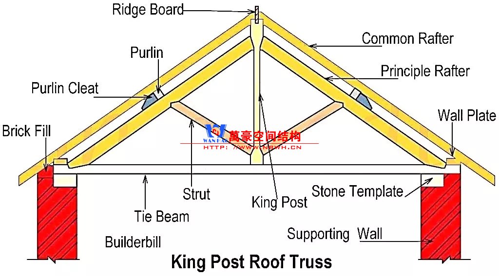 早期的三角桁架只有2根斜置上弦桿和1根水平下弦桿。而后,人們根據(jù)經(jīng)驗,嘗試在三角形內(nèi)部對應(yīng)弦桿中間點的位置,增加了3根腹桿,演化出單柱式屋架(KingPost Truss)和雙柱式屋架(QueenPost Truss) 兩種基本形式。
