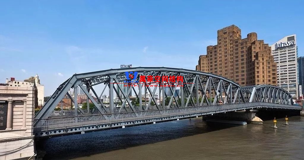 位于上海的外白渡橋是中國的第一座全鋼結(jié)構(gòu)鉚接橋梁,于1908年1月20日落成通車。該橋為下承式簡支鋼桁架,兩孔跨經(jīng)組合各52.12米,橋面鋪設(shè)電車軌道。