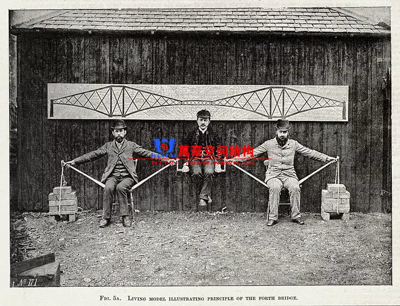 為了市民解釋懸臂桁架橋梁的原理,工程師做了一個簡易的示范試驗,以手臂作桁架拉桿、鋼棒作壓桿,兩人坐在椅子上很輕松地托起中間跨的重荷載(簡支桁架段)。圖中的三人分別是大橋的設(shè)計師JohnFowler、BenjaminBaker和工程指揮渡邊嘉一。
