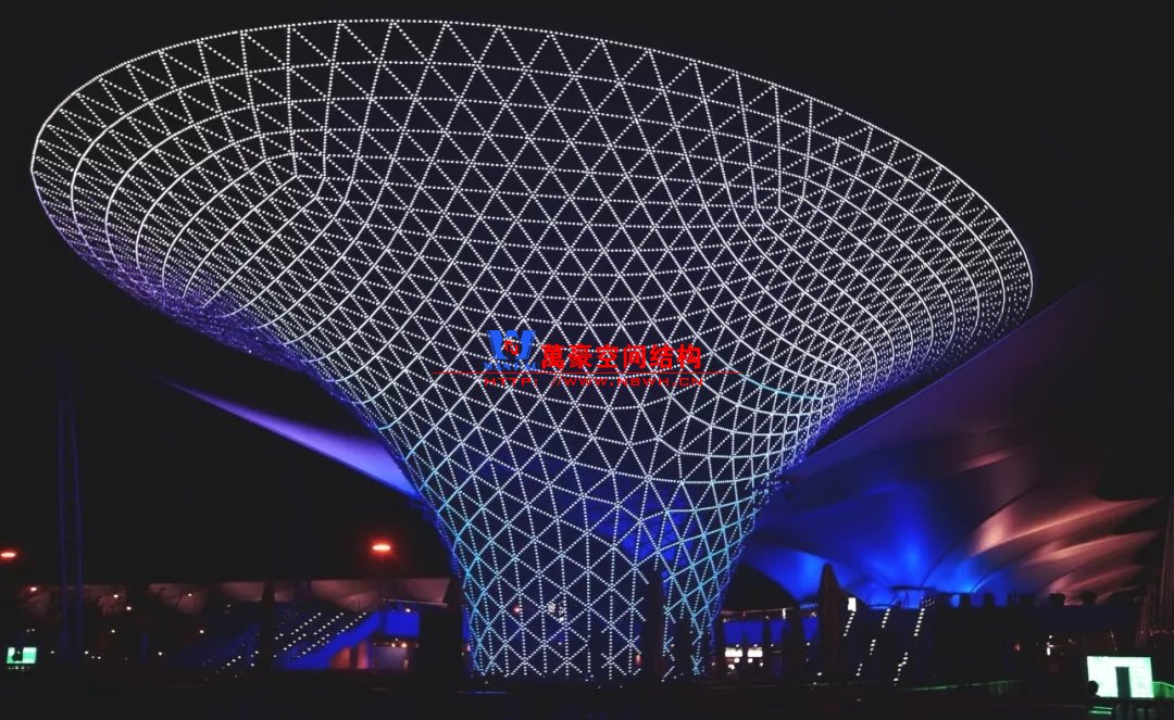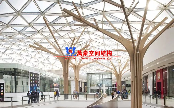 有的天幕雖然設(shè)計(jì)為曲面,但其曲面形狀的力學(xué)性能差,結(jié)構(gòu)受力仍然以抗彎為主。這類曲面天幕結(jié)構(gòu)與樹形柱相結(jié)合,才能以較細(xì)小的結(jié)構(gòu)構(gòu)件完成。