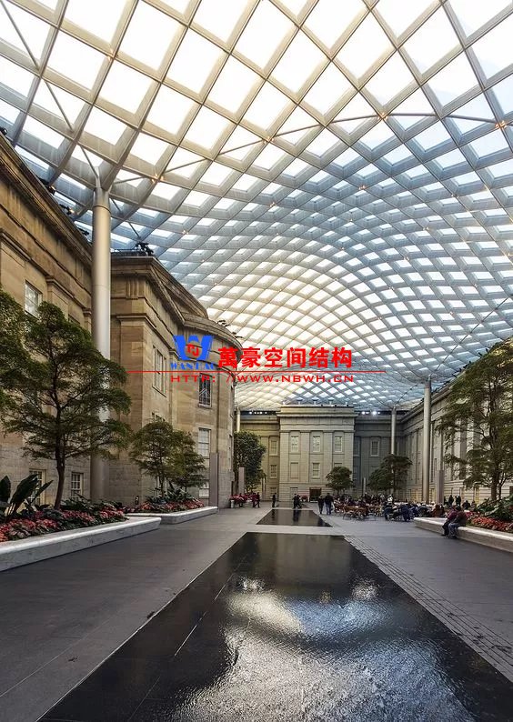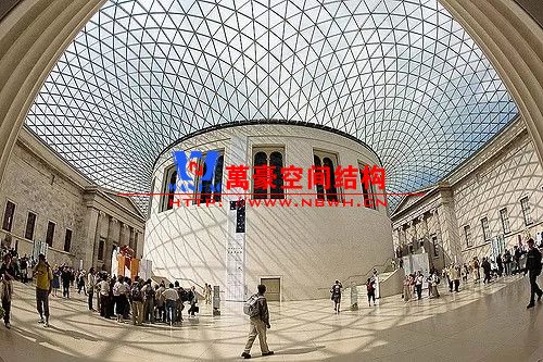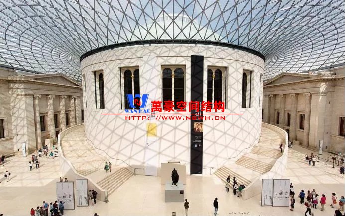 這個(gè)經(jīng)典的改造項(xiàng)目把輕與重巧妙組合。鋼結(jié)構(gòu)網(wǎng)殼內(nèi)側(cè)支承于圓形閱覽室,外側(cè)支承于方形博物館建筑的內(nèi)墻,通過找形分析得到一個(gè)拱起的規(guī)則形態(tài)。