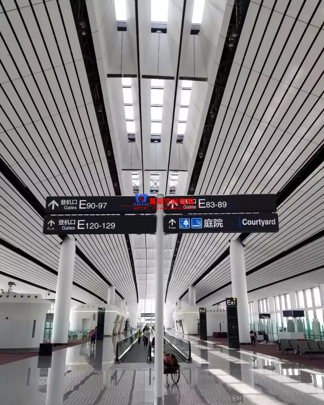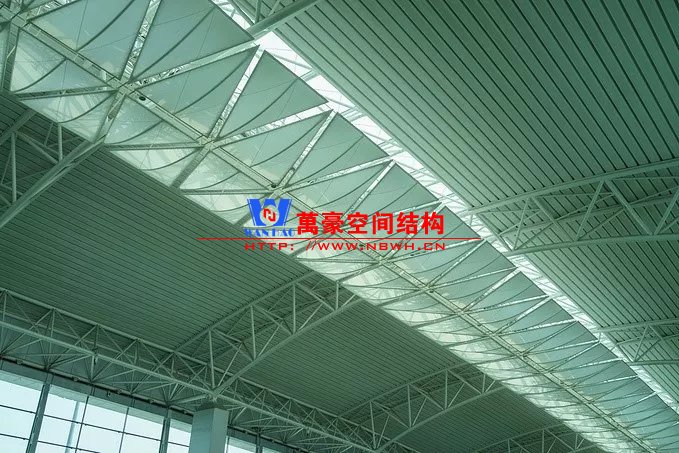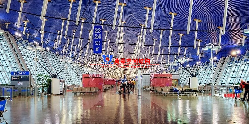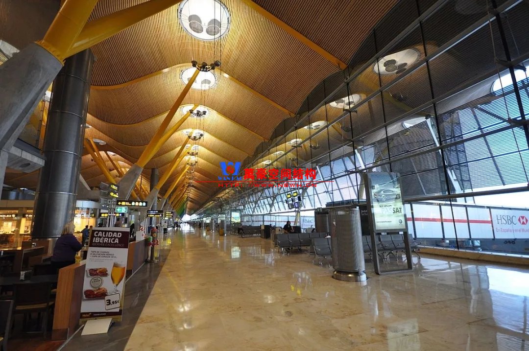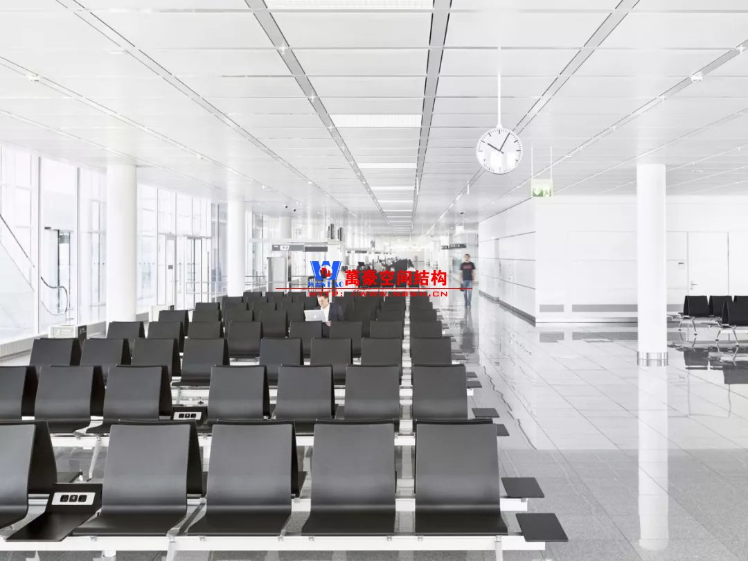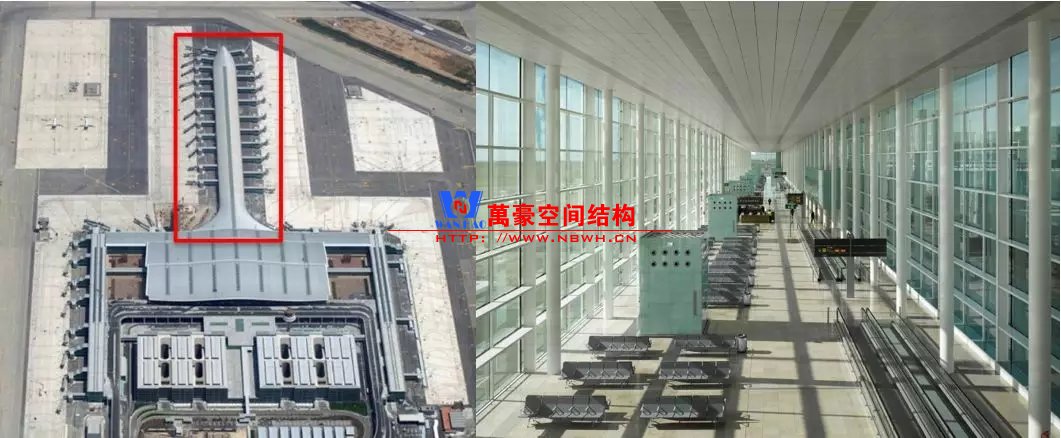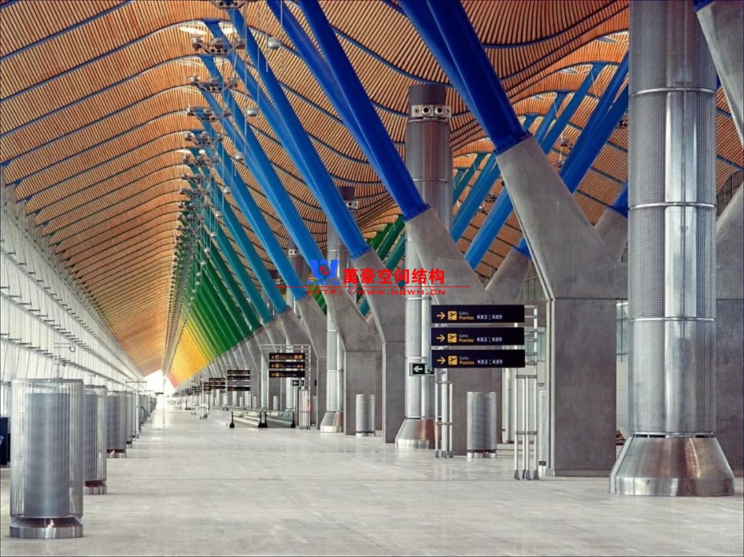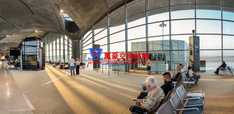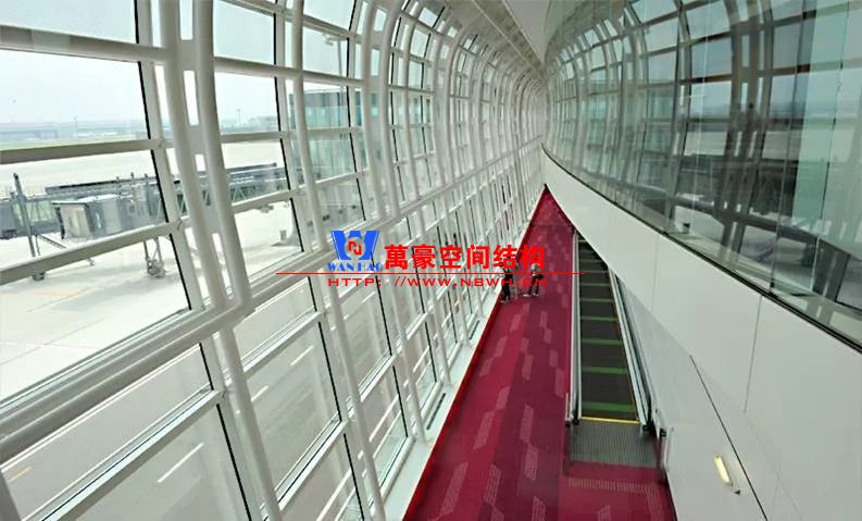 如巴塞羅那機(jī)場的指廊就是采用簡單的鋼框架結(jié)構(gòu)體系,鋼柱布置于兩邊;幕墻采用剛性幕墻,貼近鋼柱外側(cè)布置;室內(nèi)吊頂無天窗,吊頂走向沿長向,空間上有指向性。