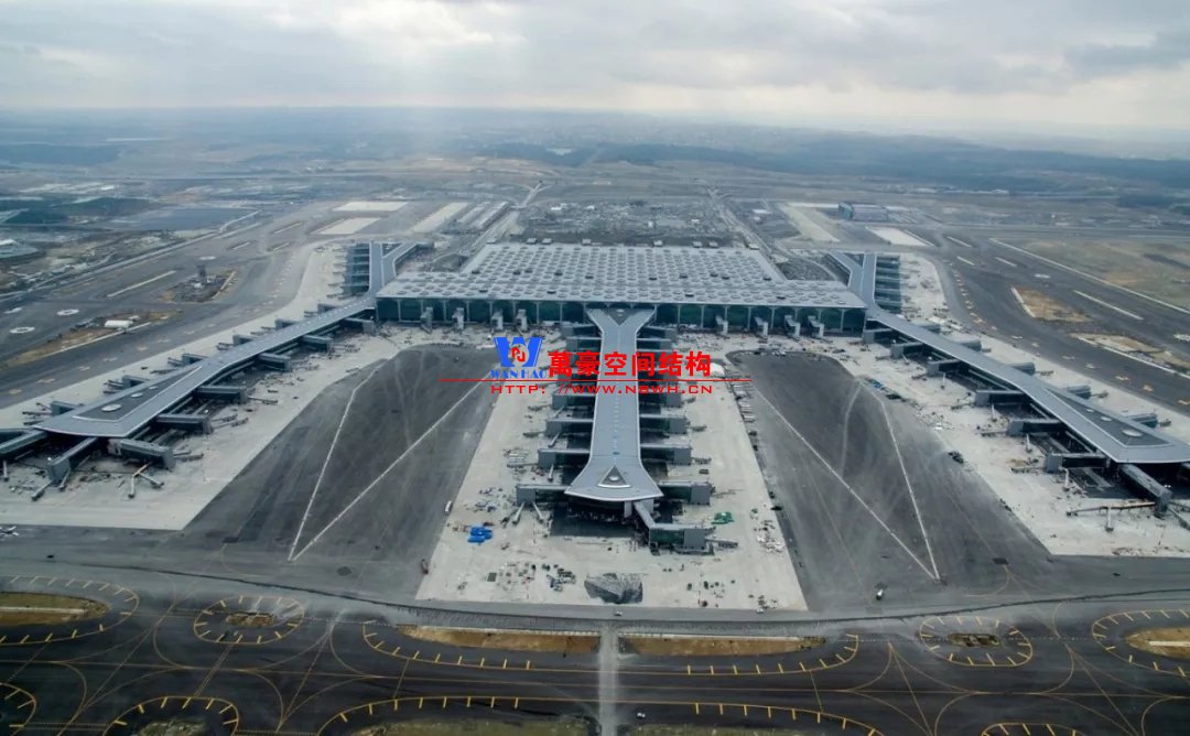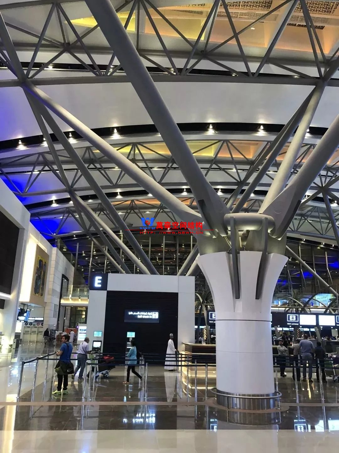 如果室內(nèi)建筑吊頂效果比較特殊,那么空間網(wǎng)格結(jié)構(gòu)更能發(fā)揮其適應(yīng)性強(qiáng)的特點,比如伊斯坦布爾新機(jī)場。室內(nèi)是單元式的吊頂曲面比較復(fù)雜,設(shè)計時采用空間交叉桁架結(jié)構(gòu)貼合表皮布置桁架弦桿,同時在桁架之間搭設(shè)次桁架和次梁形成復(fù)雜的吊頂面。通過化整為零的方法,結(jié)構(gòu)建造難度大大降低,最終建筑效果也很好。同時中部混凝土柱承擔(dān)豎向力,立面布置斜撐增加結(jié)構(gòu)的抗側(cè)剛度,兩類柱子在尺度和顏色上形成反差,在視覺上就能感受到結(jié)構(gòu)的邏輯。
