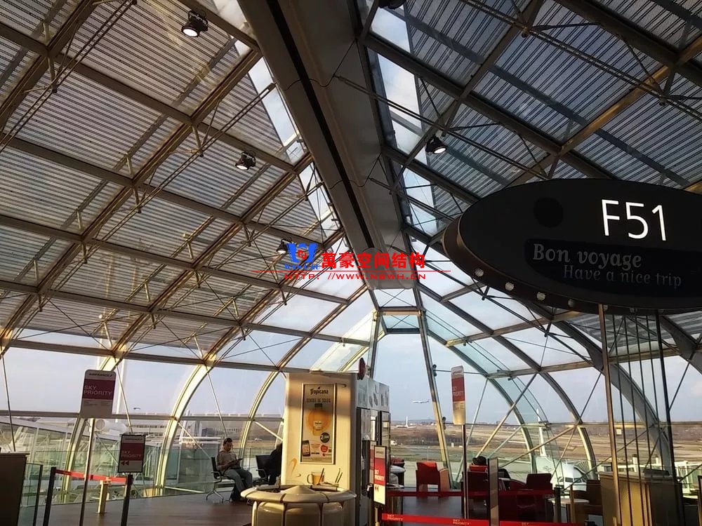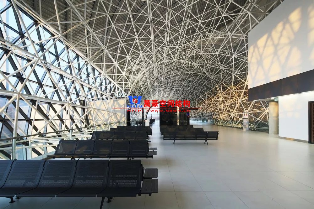 克羅地亞札格瑞布機(jī)場剖面也是筒形,結(jié)構(gòu)采用網(wǎng)架結(jié)構(gòu),但網(wǎng)架沒有外包。網(wǎng)架構(gòu)件和網(wǎng)架球節(jié)點直接暴露在近人的尺度,但從照片上看并沒有顯得很雜亂,這可能是因為結(jié)構(gòu)構(gòu)件和節(jié)點的尺度控制的很好,細(xì)而密的構(gòu)件顯得比較精細(xì)。