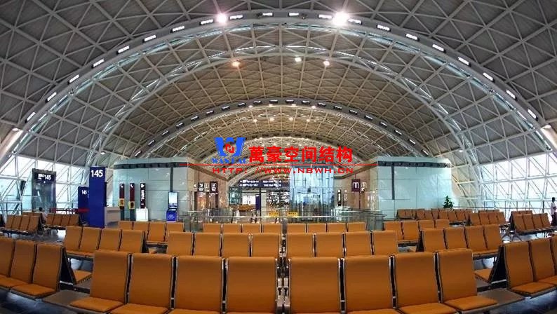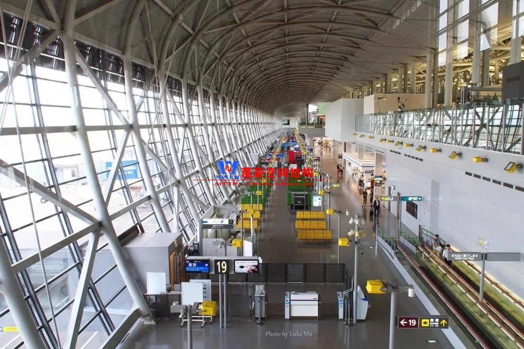 大阪關(guān)西機(jī)場則采用弧形鋼梁+索的結(jié)構(gòu)體系,有效減小了鋼梁尺寸,同時由于沒有天窗光線作用,鋼索并不明顯。可能是由于日本是地震多發(fā)地區(qū),外露的支撐構(gòu)件比較多略顯雜亂。