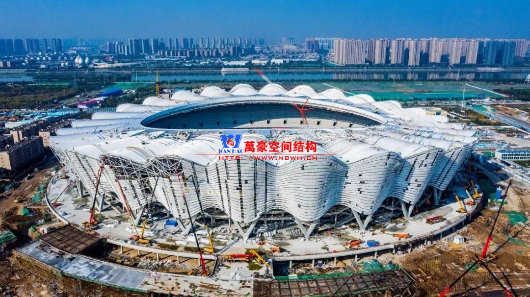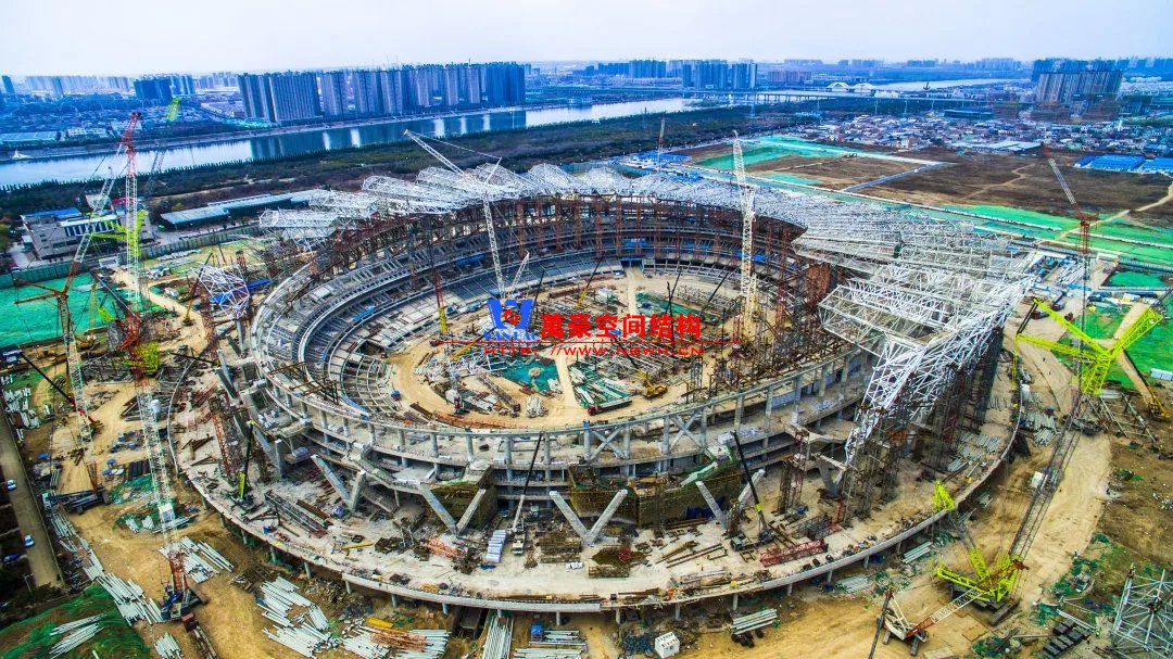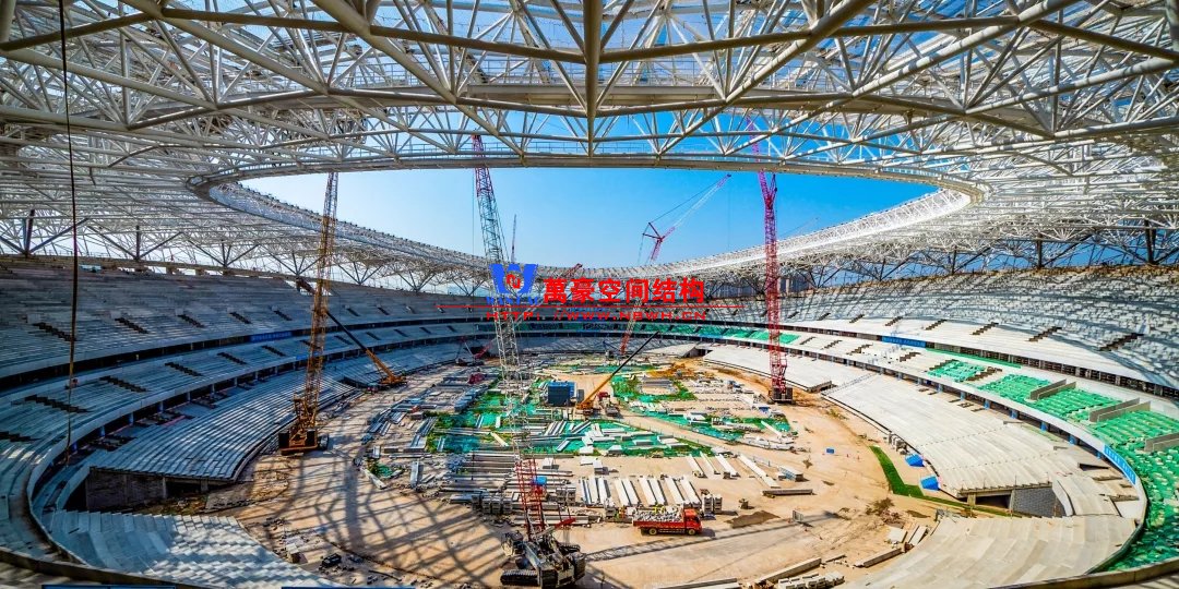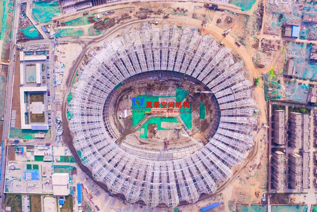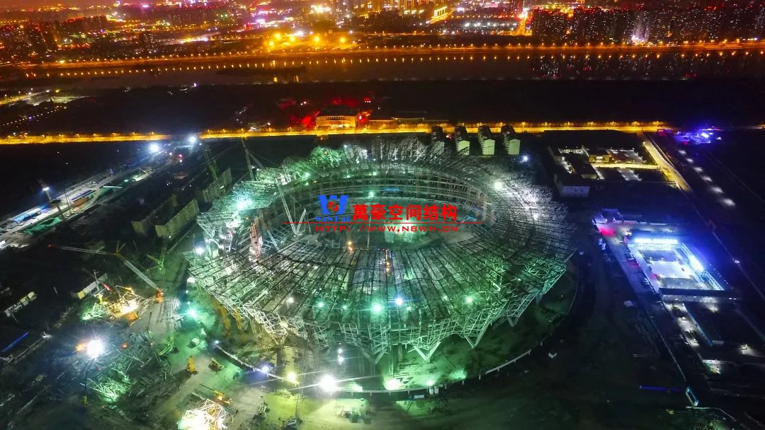 體育場罩棚整體造型呈馬鞍形,采用空間管桁架懸挑結(jié)構(gòu)體系,南北長332m,東西寬316m,罩棚最高58.3m。2019年1月1日首吊,鋼結(jié)構(gòu)分包中建鋼構(gòu)歷時(shí)87天,消耗近5萬工日、逾5千機(jī)械臺班,完成168單元、9500噸罩棚鋼桁架吊裝工作,于3月28日提前合攏。