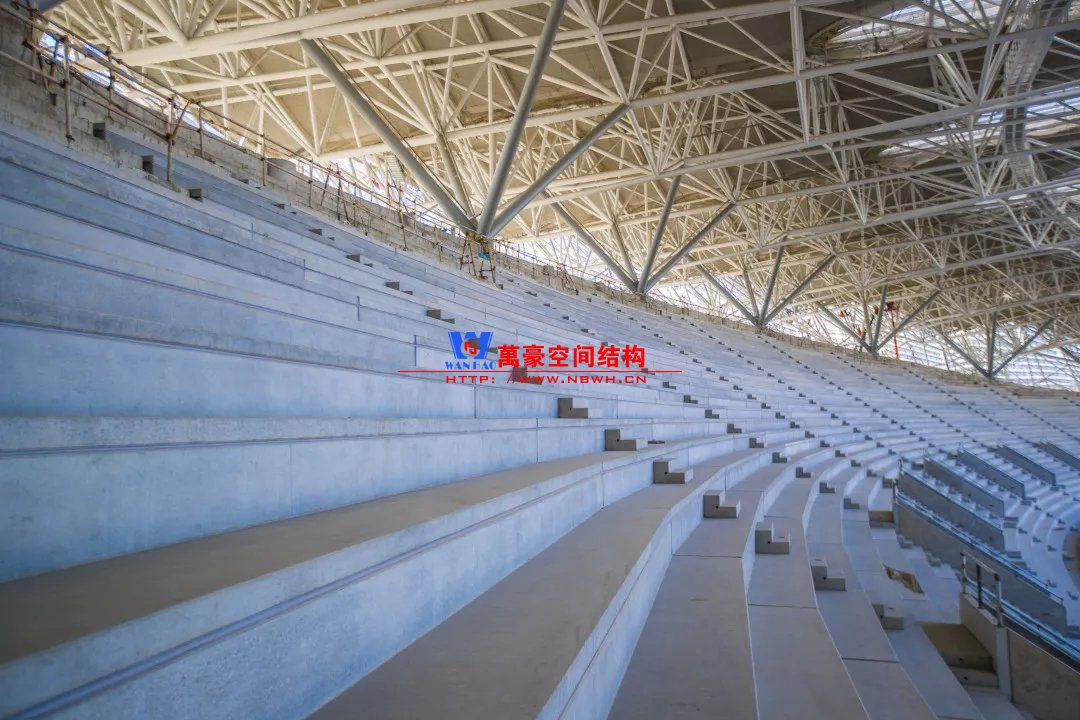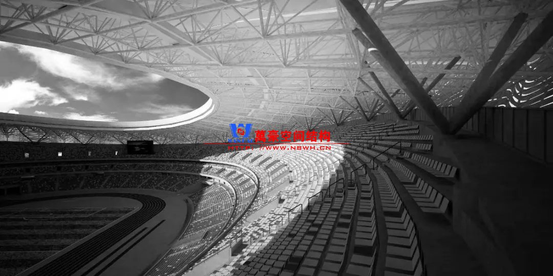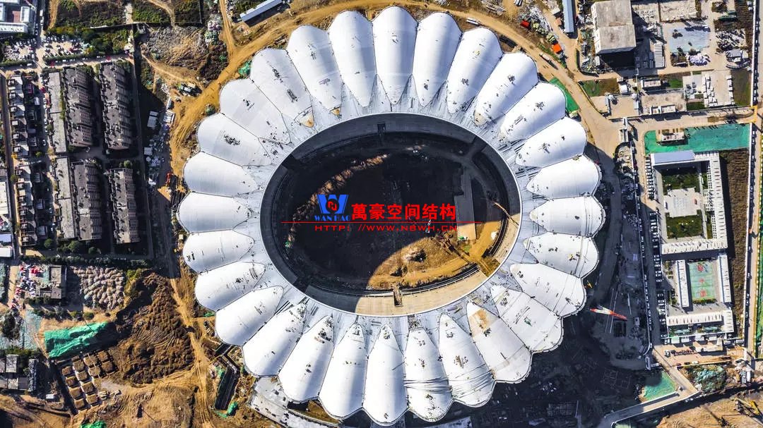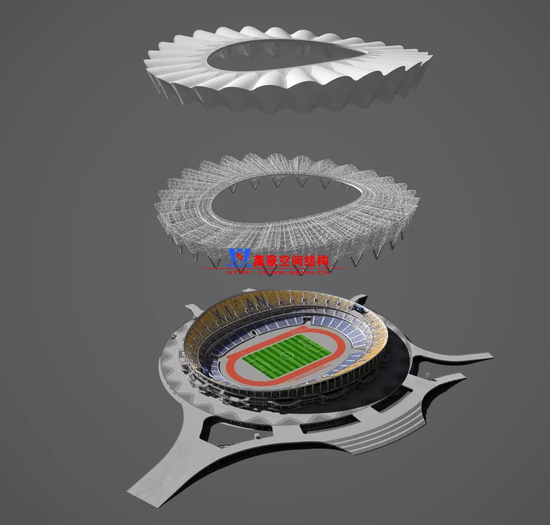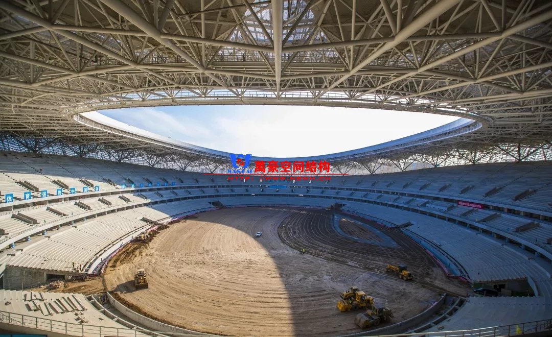體育場主體建筑為南北長332m、東西寬316m的橢圓形,鋼結(jié)構(gòu)罩棚最高處高58.3m,最低處高42.6m;中間開口南北長200m、東西寬153m。主體鋼結(jié)構(gòu)采用空間懸挑鋼桁架結(jié)構(gòu),由28個(gè)V形柱支撐72片鋼結(jié)構(gòu)管桁架,整體東西高,南北低,呈馬鞍形,體育場看臺為框架-剪力墻體系。屋頂圍護(hù)結(jié)構(gòu)為鋁鎂錳直立鎖邊金屬屋面,罩棚立面采用銀白色穿孔鋁板幕墻系統(tǒng),通過有韻律的變化,表達(dá)了絲綢飄舞的動感,輕盈通透的罩棚在夜晚能夠透出賽場內(nèi)熱烈的賽事氣氛,宛如皓月長空下綻放的盛世之花。碗型看臺分為上、中、下三層座席,并在中上層看臺之間設(shè)置包廂層(包括66個(gè)大小包廂)及其座席區(qū),觀眾分別由各層看臺對應(yīng)的通道進(jìn)入。
