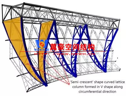 盧賽爾體育場外形就像一個碩大的“金缽”,其主體及看臺鋼結(jié)構(gòu)總用鋼量約3萬噸,相當(dāng)于三個埃菲爾鐵塔的重量。V柱是項(xiàng)目主體鋼結(jié)構(gòu)的重要組成部分,總重量約為6271噸,是“金缽”主要的豎向傳力系統(tǒng),為壓環(huán)以及幕墻側(cè)壁結(jié)構(gòu)提供支承,并將豎向力傳遞到混凝土柱墩上,進(jìn)而傳遞到地面。