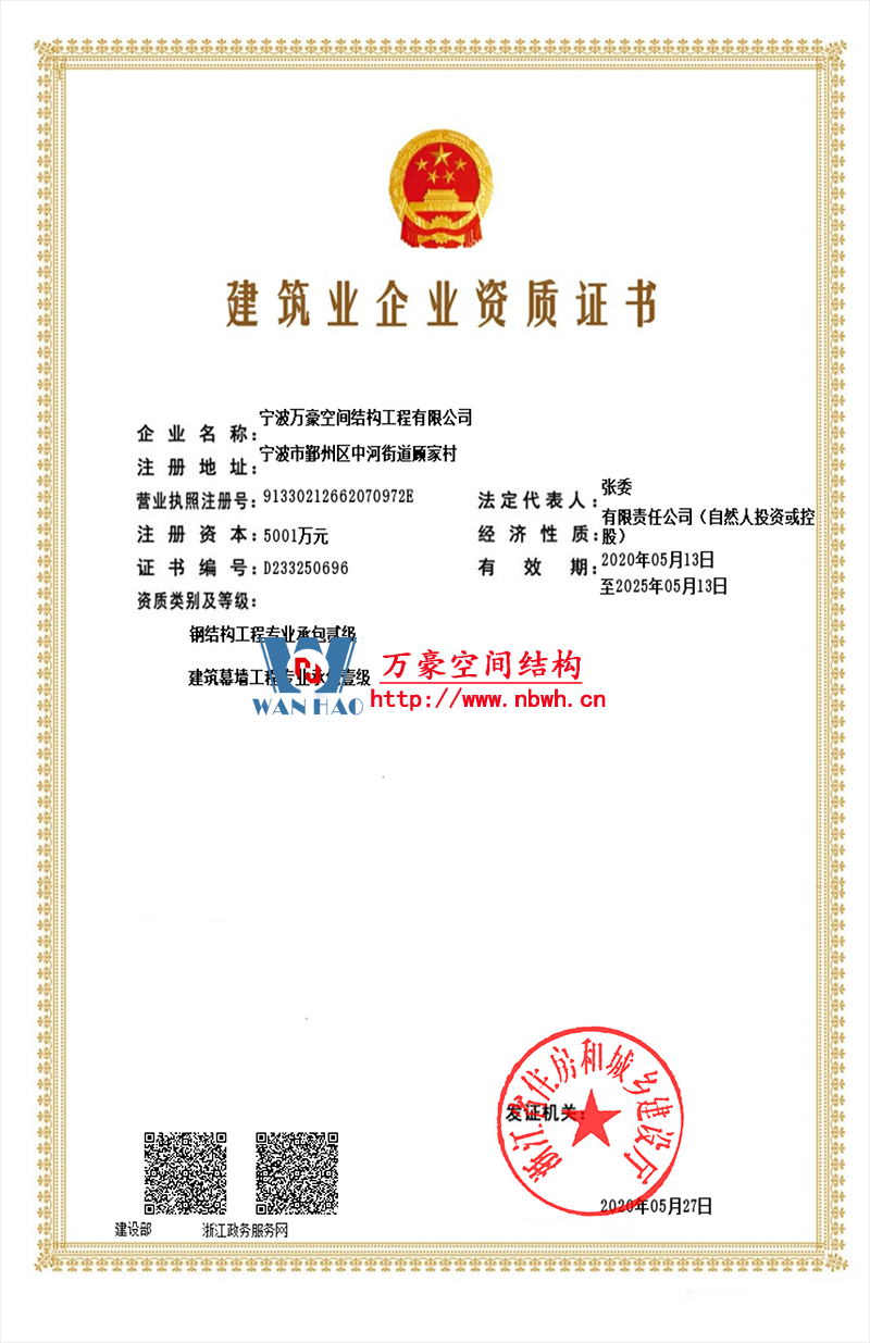• 膜結(jié)構(gòu)工程總承包特級(jí)(設(shè)計(jì)、制作、安裝)資質(zhì),鋼結(jié)構(gòu)工程二級(jí)資質(zhì)