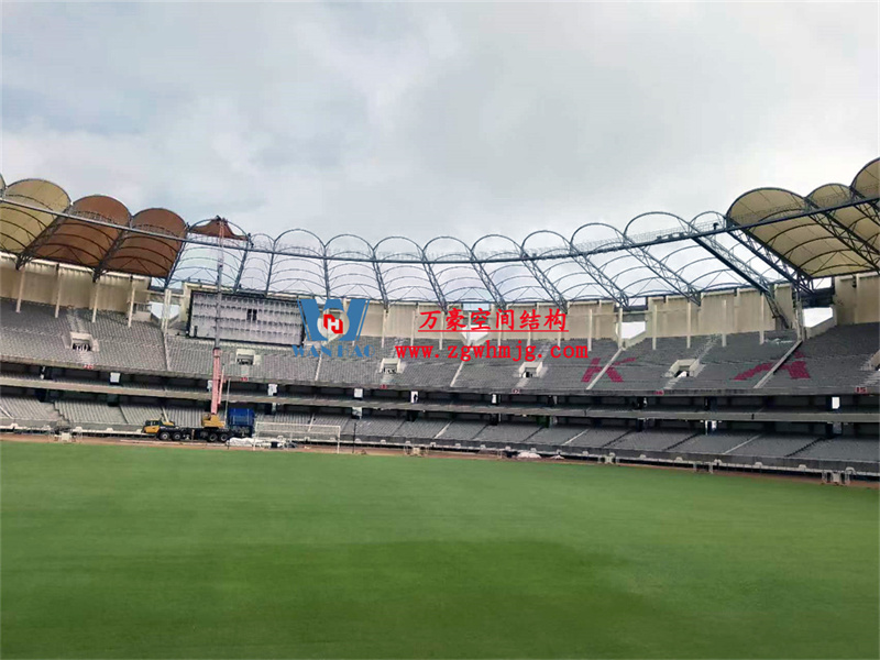 容納3萬人肯尼亞內(nèi)羅畢(非洲杯)足球體育場,屬于整體性改擴建項目,因體育場投入使用30余年,原設(shè)施落后陳舊,改造設(shè)計要求充分考慮原基礎(chǔ)結(jié)構(gòu)安全。項目前期需要進行基礎(chǔ)立柱定位,結(jié)構(gòu)屋面拆除等相關(guān)工作,并通過科學有效的技術(shù)措施處理,3D掃描,健康檢測,建模分析等,經(jīng)過多輪方案比選后,最終選擇PTFE膜屋面大懸挑空間結(jié)構(gòu)。主體桁架懸挑45米,橫向聯(lián)系向上起拱,屋面采用高自潔PTFE膜結(jié)構(gòu),開口式體育場內(nèi)部視野空曠無遮擋,讓非洲人民足球夢想在這里展翅高飛。該項目作為2026年非洲杯足球賽體育場之一投入使用,改擴建設(shè)計生產(chǎn)施工全部由萬豪團隊完成,充分體現(xiàn)了萬豪的設(shè)計施工服務能力,也為海外市場的拓展奠定了扎實的基礎(chǔ)。