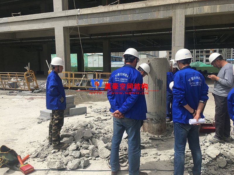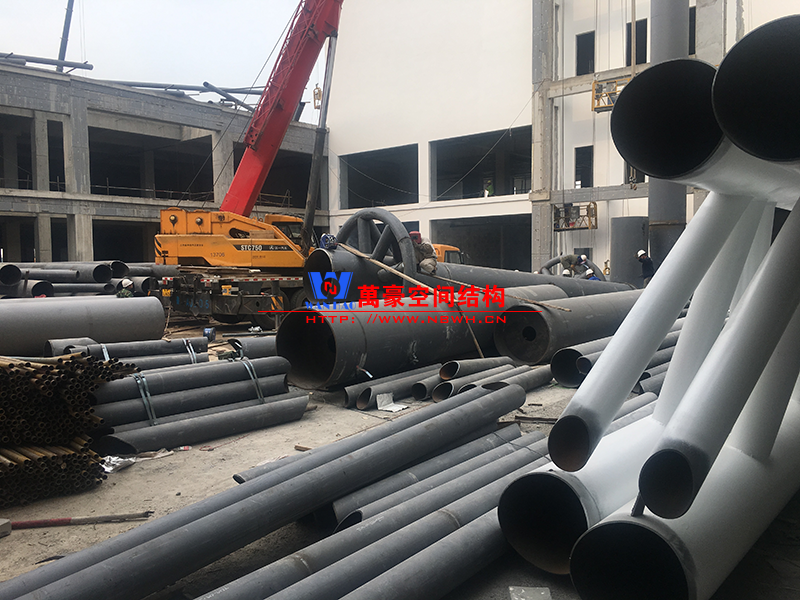 目前一號云朵鋼柱立起3根,懸挑管架全部拼裝完畢,桁架拼裝完成;二號云朵鋼柱立起3根,桁架、漏斗已基本到位,懸挑構件焊接中;三號云朵鋼柱焊接中,隔板、環(huán)板正在有序拼裝。