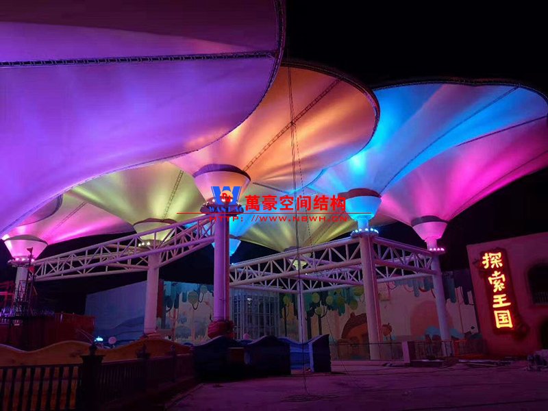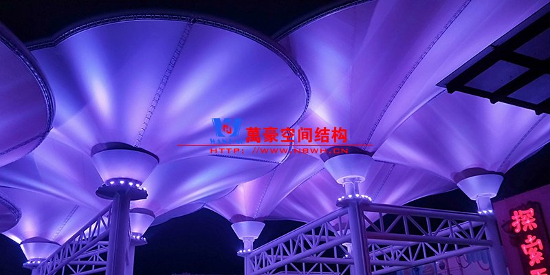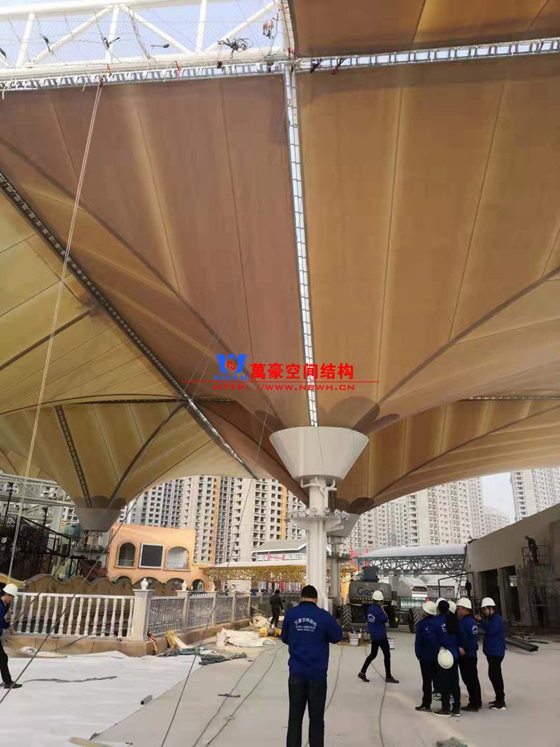 ? 聊城歡樂(lè)小鎮(zhèn)七彩云朵項(xiàng)目膜結(jié)構(gòu)工程倒傘型最大單體8千平米,落地立柱最高60米,直徑1.2米,最大懸挑36米,項(xiàng)目創(chuàng)造了國(guó)內(nèi)文旅商業(yè)類屋頂?shù)箓泐愔睢艄庖呀?jīng)進(jìn)入安裝調(diào)試階段,五彩繽紛的造型在夜幕中綻放更有獨(dú)占鰲頭的磅礴氣勢(shì)。領(lǐng)導(dǎo)肯定的說(shuō)該項(xiàng)目在當(dāng)?shù)?0年內(nèi)再無(wú)其他項(xiàng)目超越,自信和自豪并存,膜結(jié)構(gòu)項(xiàng)目得到業(yè)主總指揮及相關(guān)管理部門的高度評(píng)價(jià)和認(rèn)可,極大的鼓舞了現(xiàn)場(chǎng)施工氣氛與斗志,對(duì)現(xiàn)場(chǎng)要求再接再厲一氣呵成,爭(zhēng)做經(jīng)典之作。