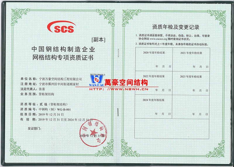 喜訊!喜訊! 萬豪膜結(jié)構(gòu)獲得中國鋼結(jié)構(gòu)制造企業(yè)網(wǎng)格結(jié)構(gòu)專項(xiàng)資質(zhì)證書。