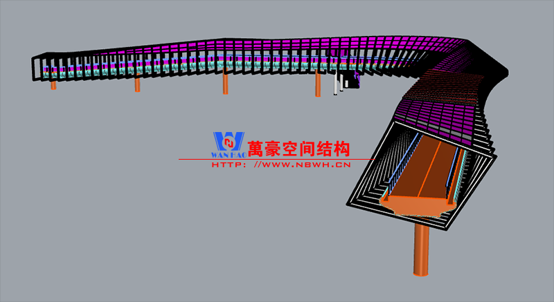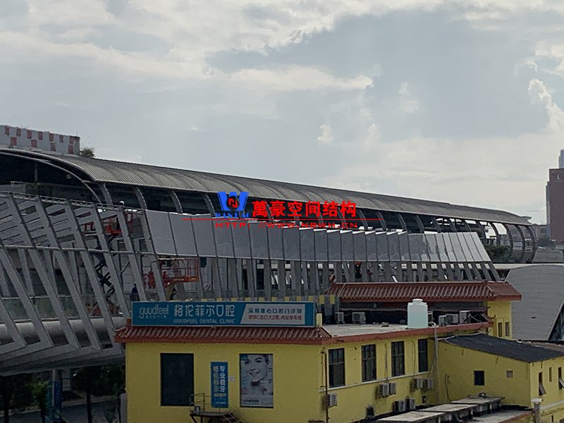 深圳龍崗三館一城項目市政配套工程1號連廊膜結(jié)構(gòu)工程項目為單層ETFE膜結(jié)構(gòu),共劃分為101個單元,總面積約為2000㎡,由寧波萬豪空間結(jié)構(gòu)工程有限公司承建。膜結(jié)構(gòu)原材采用德國NOWOFOL-300μm鍍點ETFE材料,保證透光率的同時,兼顧防范紫外線。膜結(jié)構(gòu)四周利用鋁合金夾具固定于主鋼結(jié)構(gòu)二次構(gòu)件上,膜面采用PE鋼索輔助支撐,確保膜面有效承擔(dān)相應(yīng)動荷載。