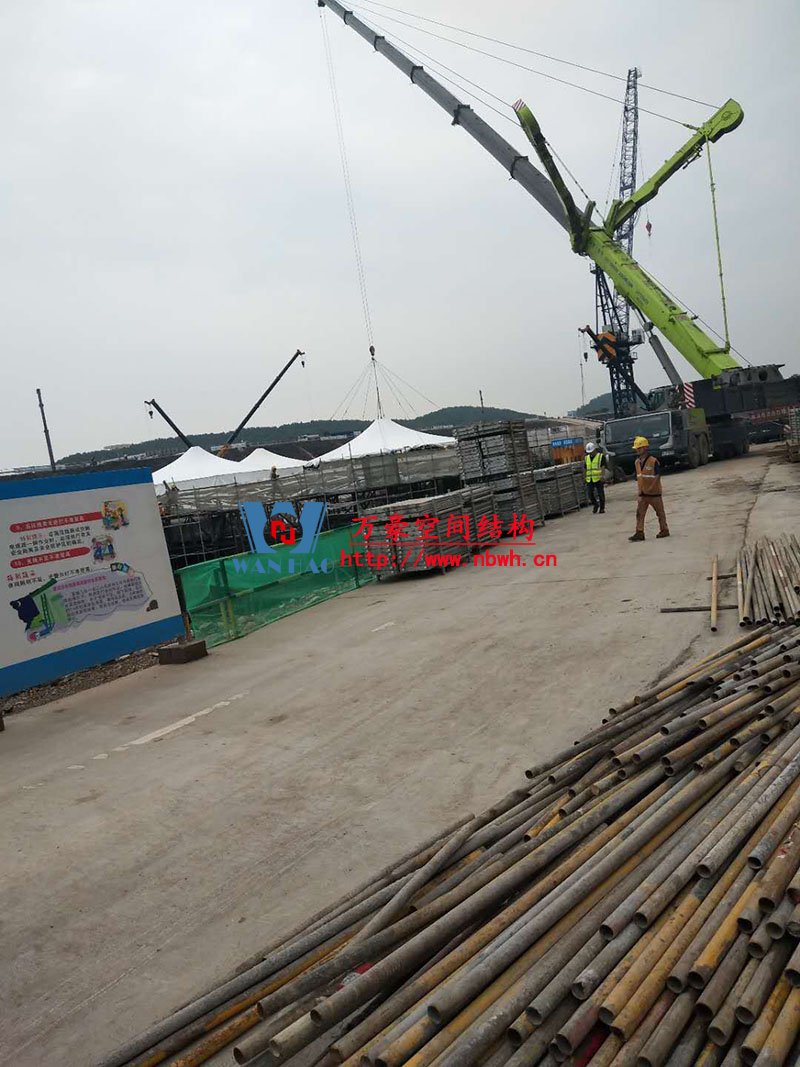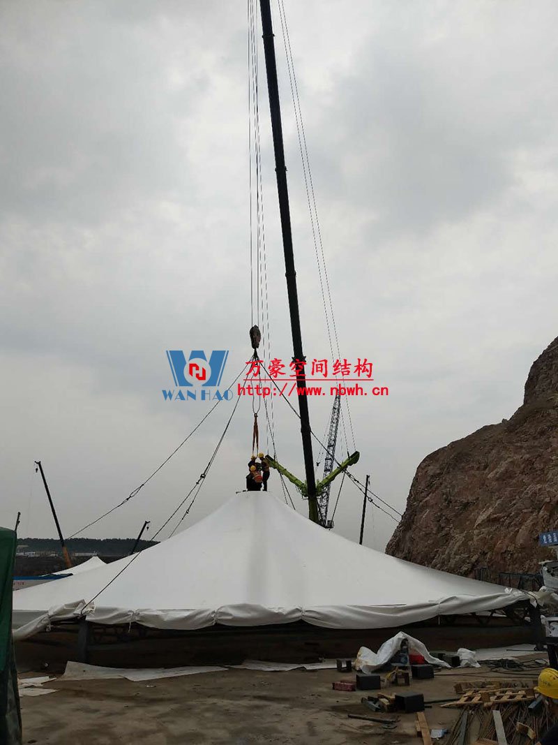 南京園博園穹蓋式膜結(jié)構(gòu)棚項(xiàng)目位于南京市江寧區(qū)湯山風(fēng)景區(qū),該工程由寧波萬(wàn)豪空間結(jié)構(gòu)工程有限公司承建。 目前,第一個(gè)保溫棚已經(jīng)吊裝到位,接下來第二、第三個(gè)棚按順序拼裝和安裝。