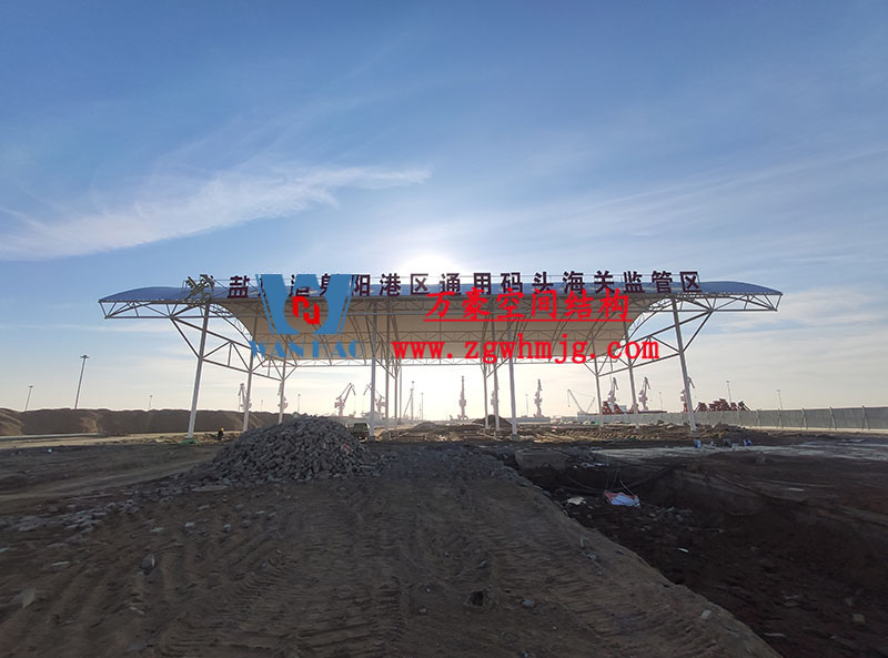 射陽港港區(qū)國家一類開放口岸一關(guān)兩檢查驗設(shè)施項目位于江蘇省鹽城市射陽縣臨港工業(yè)園區(qū),用鋼量150噸,膜結(jié)構(gòu)展開面積3000平米,由寧波萬豪空間結(jié)構(gòu)工程有限公司承建。