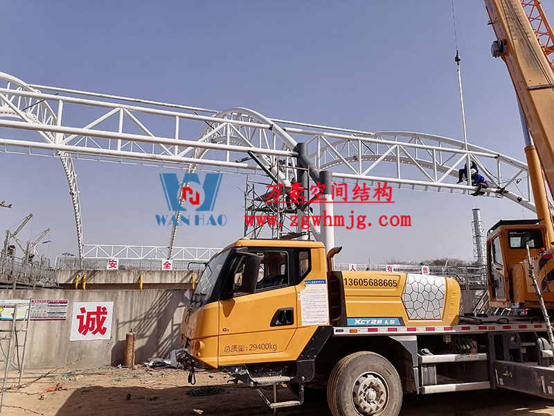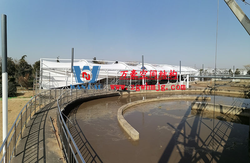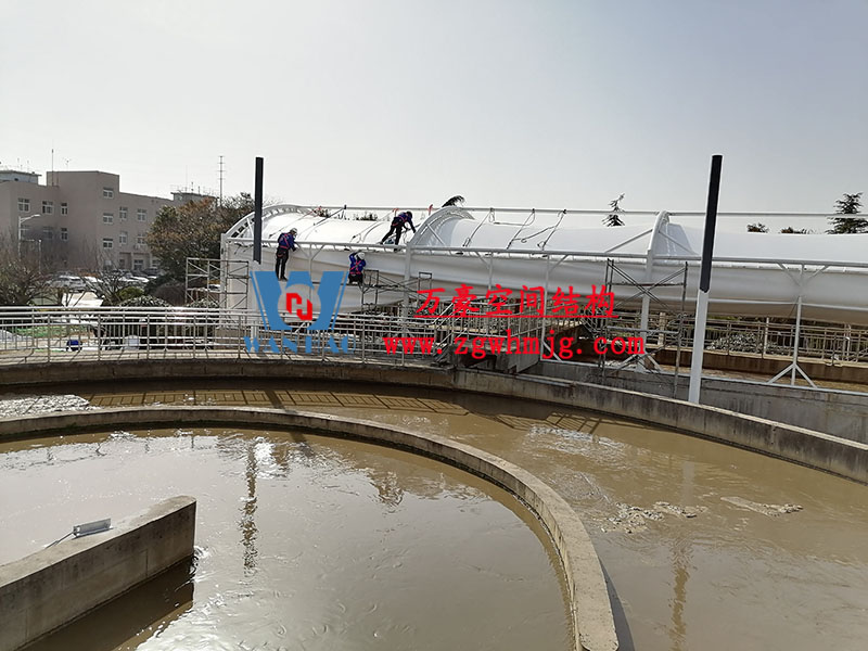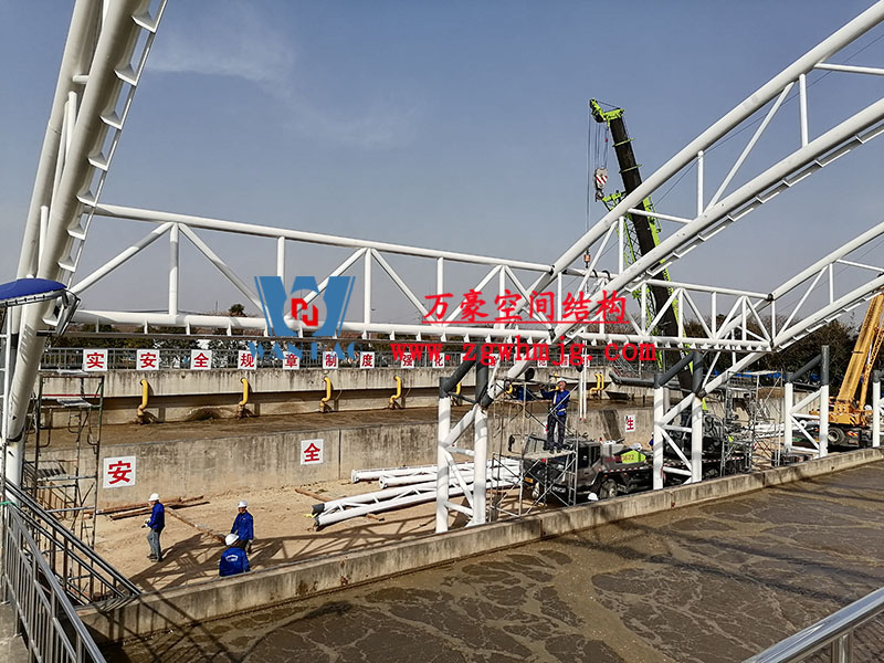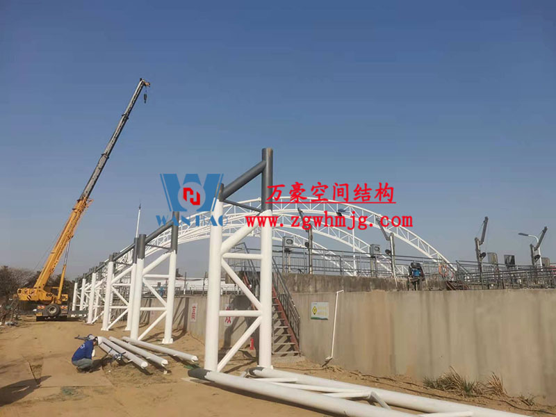 目前,進水口、粗格柵、細格柵、厭氧池兩個池子鋼結(jié)構(gòu)都已完成 ,厭氧池立面膜已張拉,開始裝側(cè)面膜,南區(qū)氧化溝三個主桁架完成 ,準(zhǔn)備進行下一步施工。