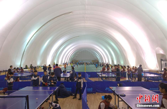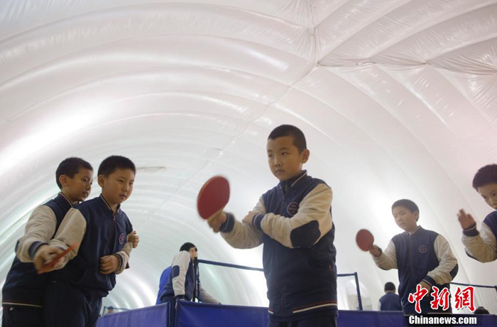12月1日,一群學(xué)生在北京市某學(xué)校充氣膜體育館學(xué)習(xí)乒乓球。 (來自:中國新聞網(wǎng))