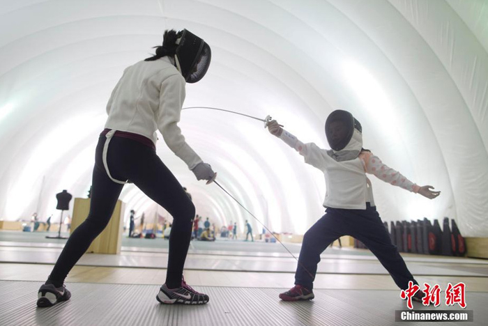 12月1日,一位學(xué)生在北京市某學(xué)校充氣膜體育館學(xué)習(xí)擊劍。11月29日空氣重污染橙色預(yù)警;11月30日霾橙色預(yù)警;12月1日大霧橙色預(yù)警。北京史上首次三個(gè)預(yù)警全“橙”發(fā)送。截至昨日,今年最嚴(yán)重空氣污染過程已持續(xù)了5天。昨夜,冷空氣抵達(dá)北京,霧霾逐漸消散。今起至4日,京城空氣優(yōu)良。昨日24時(shí),市空氣重污染應(yīng)急指揮部解除北京空氣重污染橙色預(yù)警。 (來自:中國新聞網(wǎng))