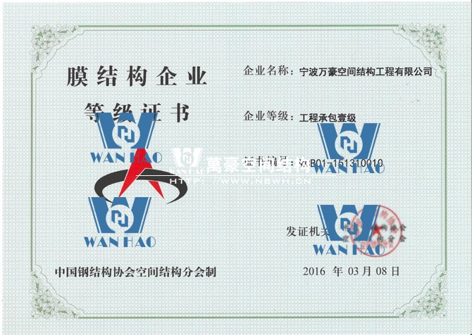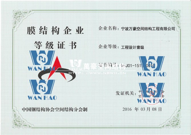 憑借著公司的硬實(shí)力,寧波萬豪空間結(jié)構(gòu)工程有限公司在膜結(jié)構(gòu)企業(yè)等級(jí)會(huì)員第十六次評(píng)審中榮獲工程承包、專項(xiàng)設(shè)計(jì)雙一級(jí)資質(zhì)。標(biāo)志著公司向前更進(jìn)一步,也是協(xié)會(huì)對(duì)公司實(shí)力的認(rèn)可,公司將不斷努力,為膜結(jié)構(gòu)行業(yè)的發(fā)展貢獻(xiàn)自己的力量。