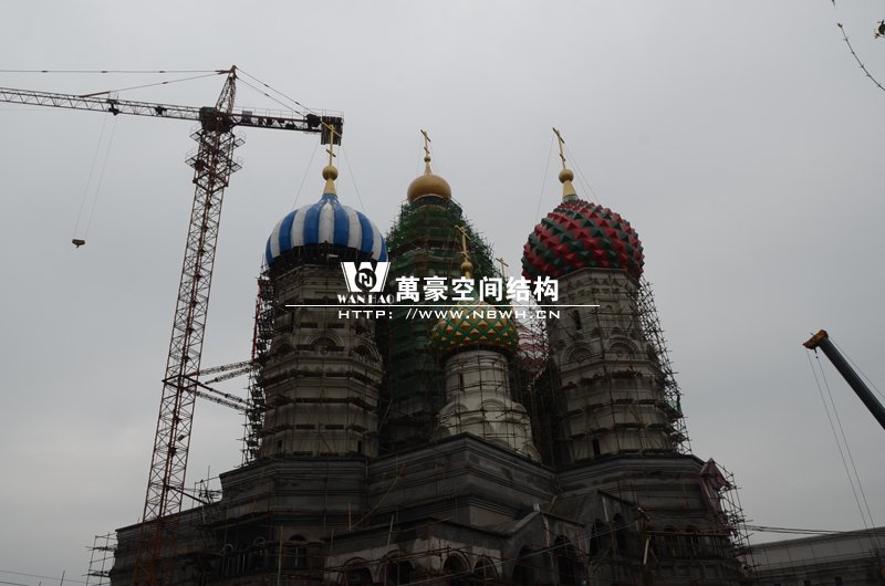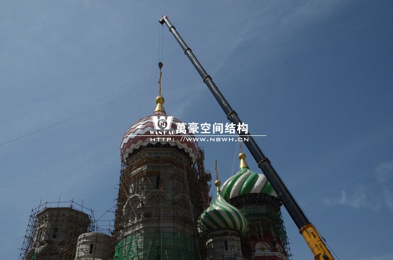 橫店圓明新園俄羅斯館屋頂整體吊裝順利完成,300多噸的大吊車,20多噸重的鋼結(jié)構(gòu)裝飾球,80米高的作業(yè)平臺(tái),在萬豪現(xiàn)場(chǎng)管理人員和工人的緊密協(xié)調(diào)下,經(jīng)過一周的晝夜努力終于大功告成,本次吊裝從4月17日開始,前期天氣晴朗無風(fēng),是吊裝的好天氣,吊裝也是順利進(jìn)行,之后的幾天陰雨不斷,大家為了吊裝盡快順利完成,在雨小的時(shí)候冒雨進(jìn)行吊裝,終于在4月22日吊裝正式完成。