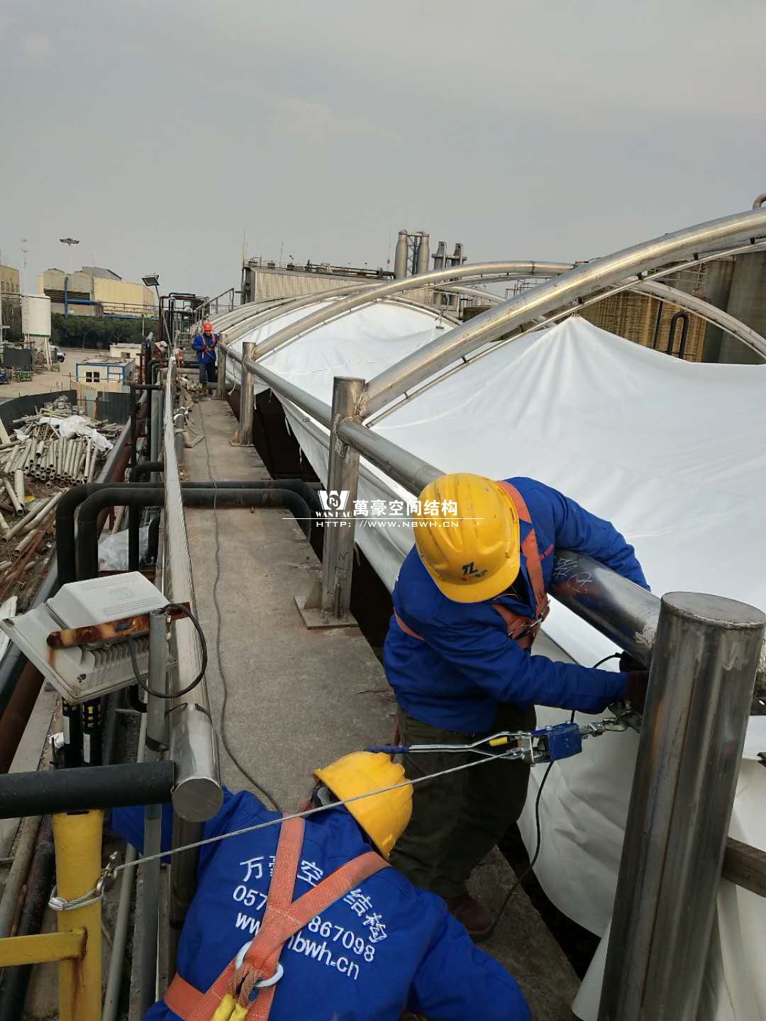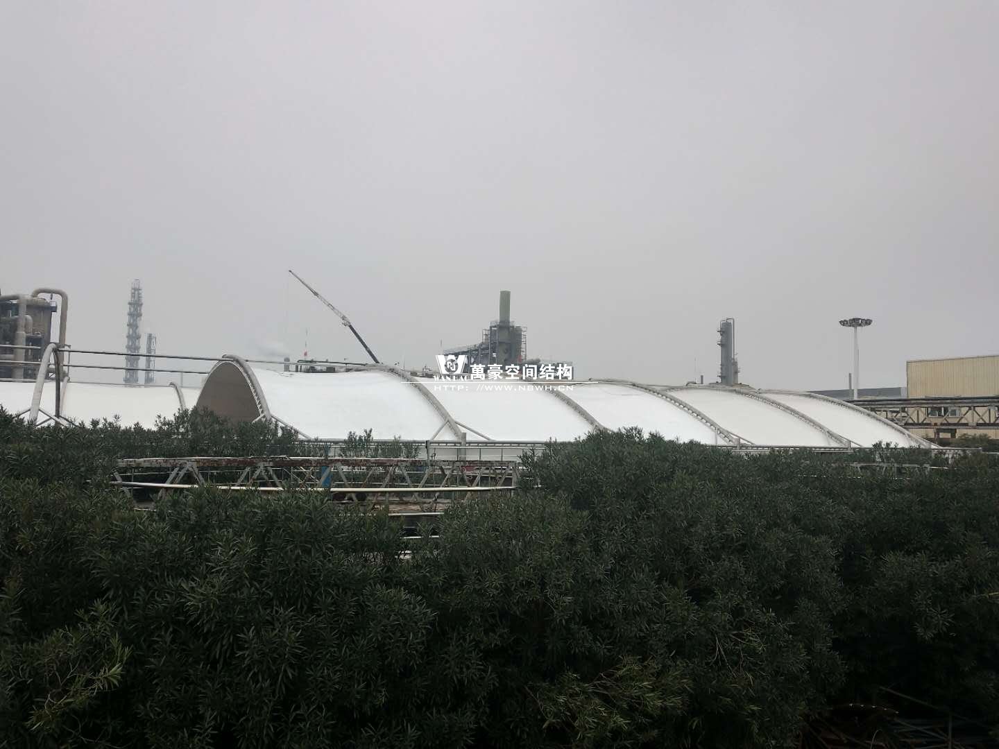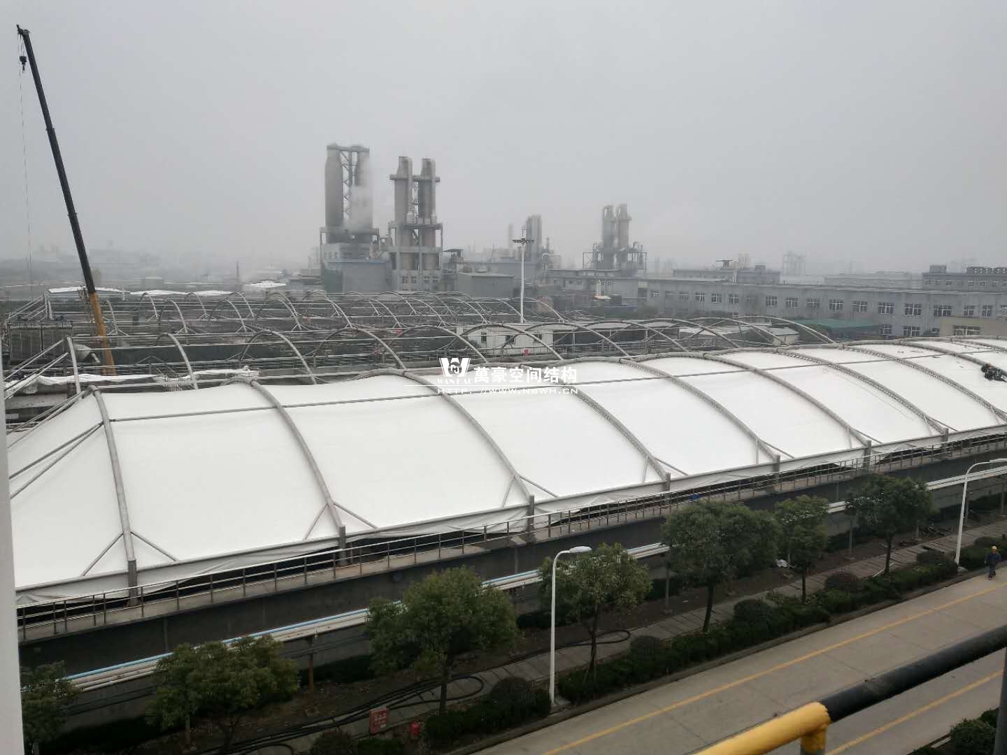 東廠區(qū)生化池加蓋工程,坐落于浙江省紹興市杭州灣上虞經(jīng)濟(jì)開發(fā)區(qū)龍盛科技園內(nèi)。整個項(xiàng)目由A/O池加蓋4座、二沉池加固定蓋4座、濃縮池加蓋2座、氧化池加蓋1座、氧化氣浮池加蓋1座、氧化集水池加蓋1座、出水調(diào)節(jié)池1座、安諾池1座,共計(jì)15座鋼膜結(jié)構(gòu)組成。總用鋼量達(dá)350噸,總建筑面積達(dá)35000平方米。