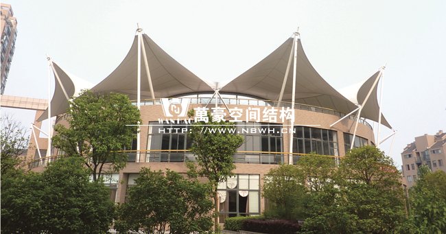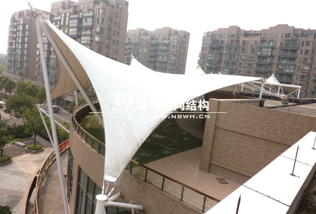 工程屹立在寧波鄞州區(qū)紫郡小區(qū),作為小區(qū)售樓處屋頂景觀,整體工程有8片單體膜組成,每片單體膜展開面積約50平方米,結(jié)構(gòu)造型飄逸輕盈,結(jié)構(gòu)受力有墻體承載,為張拉式膜建筑的典型代表,膜材高低起伏,形如波濤拍岸。極具現(xiàn)代化氣息,和諧的融與環(huán)境,成為商業(yè)小區(qū)的一道亮麗風景線。