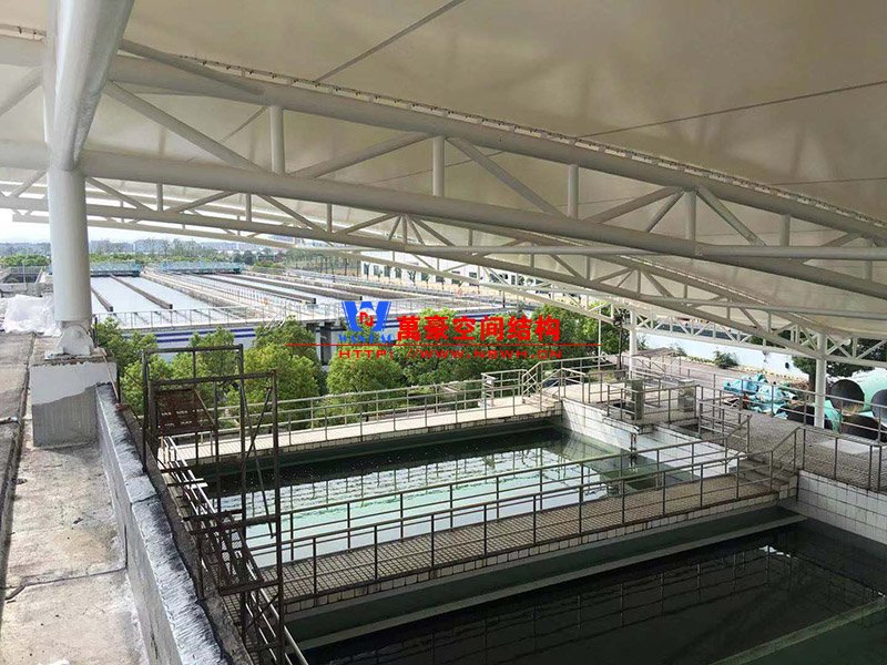 慈溪自來水廠污水池膜結(jié)構(gòu)為工業(yè)設(shè)施配套工程。結(jié)構(gòu)最大跨度40米,采用桁架結(jié)構(gòu)外覆PVC膜材的形式,建筑面積5000㎡,用鋼量330噸,膜材用量6200㎡。項(xiàng)目施工難度大,實(shí)施階段考慮到實(shí)際運(yùn)營的需要并保持自來水廠不受各項(xiàng)因素的干擾及污染(帶水作業(yè)),為該市的民生工程。